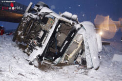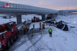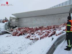 Ein LKW kam bei winterlichen Fahrverhältnissen auf der Auffahrtsrampe von der A5 auf die S1 (Fahrtrichtung Wien) von der Straße ab, überschlug sich und blieb entgegen der Fahrtrichtung auf dem Dach liegen. Der LKW war mit Rinderhälften beladen. Die Zugmaschine und der Sattelauflieger waren sehr stark beschädigt. Wir führten am Einsatzort die Bergung mit der Seilwinde unseres Kranfahrzeuges durch. Dies gestaltete sich schwierig, da auf Grund der kalten Temperaturen und auf Grund des Schneefalls die Fahrbahn komplett vereiste und das Kranfahrzeug keinen Halt bei diesen Bodenverhältnissen fand. Aus diesem Grund wurde gemeinsam mit den Kameraden der Feuerwehr Wolkersdorf in Handarbeit mittels Schaufeln und Tausalz ein Fahrbahnstück eis- und schneefrei gemacht.
