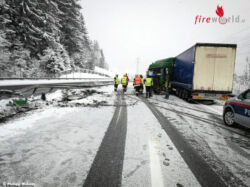 Kurz vor 10:00 Uhr prallte ein Lastkraftwagen auf der Pyhrnautobahn zwischen Mautern und Kalwang in die Mittelleitschiene und kam eingeknickt über beide Fahrspuren zum Stillstand.