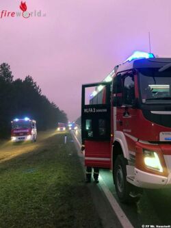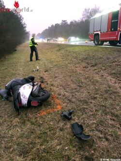 Dabei wurde ein Mopedfahrer unbestimmten Grades verletzt. Der beteiligte Pkw überschlug sich und kam in einer Baumgruppe am Dach zu liegen. Aufgrund der unklaren Örtlichkeit des Einsatzes wurden mehrere Feuerwehren alarmiert.
