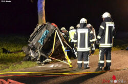 Der Harsefelder wurde in dem völlig zerstörten Wrack eingeklemmt und musste von den alarmierten Feuerwehren aus Apensen, Ruschwedel und Harsefeld mit schwerem Rettungsgerät befreit werden.Der Buxtehuder Notarzt und die Besatzung des eingesetzten Rettungswagens konnten dem jungen Mann nicht mehr helfen, er erlag noch an der Unfallstelle seinen schweren Verletzungen.Die Kreisstraße 49 musste für die Zeit der Rettungs- und Bergungsmaßnahmen sowie die Unfallaufnahme für über eine Stunde voll gesperrt werden. Der Verkehr wurde mit Hilfe der Feuerwehr umgeleitet. Zu nennenswerten Behinderungen kam es dabei aber nicht. Der Gesamtschaden wird auf ca. 15.000 Euro geschätzt.