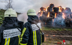 BOCHUM (DEUTSCHLAND): Um 14:12 Uhr des 31. Jänner 2017 gingen mehrere Notrufe in der Leitstelle der Bochumer Feuerwehr ein, die Anrufer meldeten brennende Strohballen auf einer Wiese an der Bergener Straße. Bei Eintreffen der ersten Einsatzkräfte wurden ca. 40 brennende Heu-/Strohballen festgestellt.