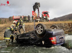 WIESENFELD (NÖ): Am 4. Februar 2018 um 13:42 Uhr wurde die Freiw. Feuerwehr Wiesenfeld zu einem Verkehrsunfall in Außer Wiesenbach, L5202 Km 2, mit dem Hinweis „Auto im Bach“, alarmiert. Ein Lenker aus Traisen kam mit seinem Fahrzeug von der Fahrbahn ab und stürzte über eine ca. zwei Meter hohe Stützmauer in den Wiesenbach und kam auf dem Fahrzeugdach im Bachbett zu liegen.
