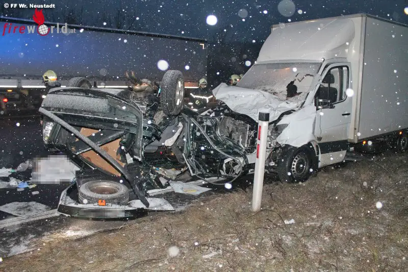 WIENER NEUSTADT (NÖ): Der Schneefall im Osten Österreichs am Mittwoch, 7. Februar 2018, beeinträchtige auch im Raum Wiener Neustadt den Frühverkehr. Innerhalb weniger Stunden musste die Feuerwehr Wiener Neustadt zu mehreren Fahrzeugbergungen und Verkehrsunfällen ausrücken. Tragisch endete ein Fahrzeugüberschlag kurz nach 06.00 Uhr. Eine 29- Jährige aus dem Bezirk Baden verstarb noch am Unfallort.