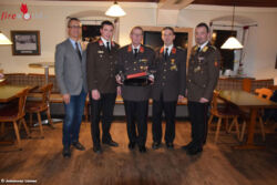 Für ihren langjährigen Einsatz im Kommando bedankte sich der neue Kommandant Hamader bei vier Kameraden mit Ehrendienstgraden: Ehren-HBI Günther Katherl, Ehren-OBI Josef Zöbl, Ehren-AW Gerhard Göbl und Ehren-AW Johann Grünbacher.