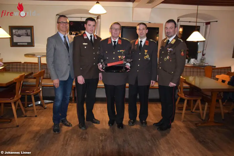 Für ihren langjährigen Einsatz im Kommando bedankte sich der neue Kommandant Hamader bei vier Kameraden mit Ehrendienstgraden: Ehren-HBI Günther Katherl, Ehren-OBI Josef Zöbl, Ehren-AW Gerhard Göbl und Ehren-AW Johann Grünbacher.