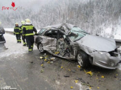 Der Pkw kollidierte dabei frontal mit dem Lkw und wurde zwischen dem Schwerfahrzeug und der Leitschiene eingekeilt, wobei eine Person im Fahrzeug eingeklemmt wurde. Da sehr ungenaue Ortsangaben vorhanden waren, wurden neben den Feuerwehren Eselsbach / Unterkainisch und Bad Aussee auch die Feuerwehren Bad Mitterndorf und Klachau alarmiert, wobei deren Einsatz während der Anfahrt storniert werden konnte.