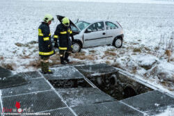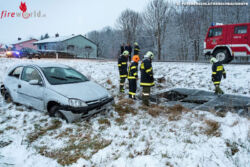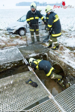 Die Dame rutschte mit dem Heck voran von der Straße auf eine Wasserdurchflussöffnung. Das Auto verhakte sich dabei auf den Gitterrostabdeckungen, überschlug sich und kam dann wieder auf den Rädern zum Stehen. Die Dame wurde dabei nur leicht verletzt. Die alarmierten Einsatzkräfte der Feuerwehr sicherte die Einsatzstelle, montierte die Abdeckungen wieder, während die Kräfte des Roten Kreuzes die Lenkerin versorgten. Für die Dauer der Aufräum- und Bergearbeiten war die Straße nur erschwert passierbar bzw. kurzzeitig gesperrt.