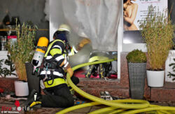 Die Einsatzkräfte der Feuerwache Mitte konnten tief schwarzen Rauch hinter den Schaufenstern des Nagelstudios feststellen. In Anbetracht der Uhrzeit konnte davon ausgegangen werden, dass keine Personen im Geschäft waren. Ein Trupp mit schwerem Atemschutz und einem C-Rohr öffneten die Ladentür.