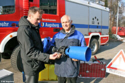 AUGSBURG (BAYERN): Herrn Ramsl von der Versicherungskammer Bayern übergab am 14. Februar 2018 der Berufsfeuerwehr Augsburg, vertreten durch den Leitenden Branddirektor Herr Habermaier, eine Miniatur-Schaum-Übungsanlage.