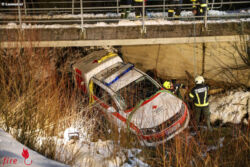 Rettungsdienst und Notarzt waren Dienstagnachmittag zu einem internen Notfall im Gemeindegebiet von Altmünster unterwegs, als das Notarzteinsatzfahrzeug bei der Anfahrt aufgrund von Glatteis von der Fahrbahn abkam und in den Schwarzenbach stürzte. Der Notarzt und der Sanitäter blieben zum Glück unverletzt. Die Leitstelle des Rettungsdienstes reagierte schnell und alarmierte zum eigentlichen Einsatzort einen Notarzthubschrauber. Die Besatzung übernahm die Versorgung des Patienten.
