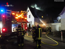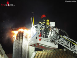 Die Außenverkleidung des Kaminzuges hatte indes schon Feuer gefangen und brennende Teile der Kaminverkleidung fielen zur jeder Dachflächenseite hinunter. Um die drohende Brandausbreitung zu verhindern, sind zwei Trupps mit C-Rohr im Außenbereich vor gegangen. Neben tragbaren Leitern kam auch eine Drehleiter mit einem weiteren C-Rohr zum Einsatz.