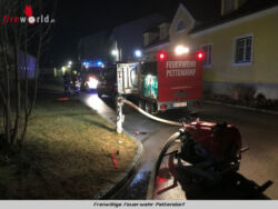 Sofort wurde die Alarmstufe von B1 auf B2 erhöht, die FF Gaisruck und FF Hausleiten nachalarmiert und mit dem Löschen des Hackguts begonnen. Parallel dazu wurde von der anderen Seite des Hauses das Dach gekühlt.