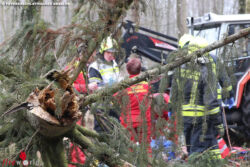 Ein 75-jähriger Landwirt aus Gollensdorf wurde bei Arbeiten im Wald nahe seines Anwesens unter einem Baum mit dem Bein eingeklemmt. Mit Hilfe des am Einsatzort anwesenden Traktors konnte der rund 50cm dicke Baum angehoben und die verletzte Person darunter befreit werden. Nach einer Stabilisierung durch den Notarzt des Rettungshubschraubers Christophorus 10 wurde der Landwirt ins Unfallkrankenhaus nach Linz geflogen.