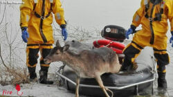 Das Tier war durch seine Versuche, sich selbst vom Eis zu befreien, völlig entkräftet und fand mit den Beinen auf dem glatten Eis keinen Halt. Am Ufer angekommen, wurde es in die Freiheit entlassen und gewann erst nach einigen Metern wieder Sicherheit auf den Beinen.