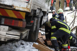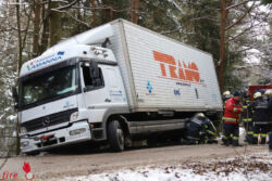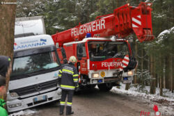 Ein italienischer Lkw-Lenker hatte offenbar blind auf sein Navigationsgerät vertraut. Auf einer schmalen Straße in einem Waldstück im Gemeindegebiet von Michaelnbach war dann vorerst Endstation. Der Lkw-Lenker blieb mit seinem Fahrzeug im aufgeweichten Boden neben der Straße hängen und konnte nicht mehr weiter. Die Einsatzkräfte der Feuerwehr bauten mit Holzstücken unter den Reifen einen festen Untergrund, auf welchem das Schwerfahrzeug dann wieder zurück auf die Straße gezogen werden konnte. Mit der Seilwinde des großen Kranfahrzeuges der Feuerwehr sowie einem Seilzug konnte der LKW schließlich geborgen werden.