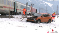 ÖBLARN (STMK): Kurz vor 8 Uhr kollidierte am Freitag, 23. Februar 2018, auf einem unbeschrankten Bahnübergang zwischen Öblarn und Niederöblarn (Kreuzungsbereich zur Landesstraße) ein Personenzug mit einem Pkw.