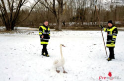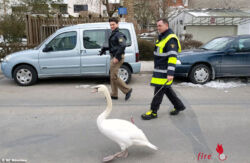 Deren Geduld war wiederum auch nicht unerschöpflich. Mit sanftem Druck wurde der Schwan bewegt, sein Lager aufzugeben und sich in Bewegung zu setzen. Die Kolonne mit dem Schwan an der Spitze und unter dem Begleitschutz von Feuerwehr- und Polizeibeamten setzte sich Richtung den in der nähe liegenden Isarauen in Bewegung. Nach einem gemächlichen Sparziergang und unter den Augen einiger amüsierter Autofahrer erreichte der stolze Vogel dann wieder seinen natürlichen Lebensraum. Alle äußeren Anzeichen deuteten darauf hin, dass der Vogel keine Verletzungen hatte.