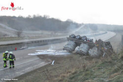 Hier war ein polnischer Sattelzug nach rechts von der Fahrbahn abgekommen und umgekippt. Auf dem Auflieger befanden sich drei Kessel, die mit flüssigem Aluminium gefüllt waren. Aus einem dieser floss das Aluminium auf die Fahrbahn und verteilte sich auf beiden Fahrspuren. Der 32jährige Lastzugfahrer wurde bei dem Verkehrsunfall leicht verletzt.