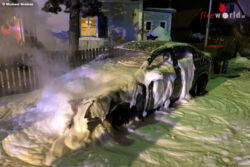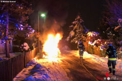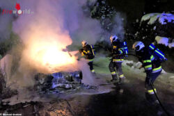 Unter schwerem Atemschutz und mit dem Schaumrohr gerüstet, begannen umgehend die Löscharbeiten. Bereits nach kurzer Zeit konnte das Feuer unter Kontrolle gebracht werden und ein Übergreifen auf einen umliegenden Baum sowie Zaun verhindert werden.
