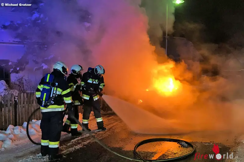 Unter schwerem Atemschutz und mit dem Schaumrohr gerüstet, begannen umgehend die Löscharbeiten. Bereits nach kurzer Zeit konnte das Feuer unter Kontrolle gebracht werden und ein Übergreifen auf einen umliegenden Baum sowie Zaun verhindert werden.