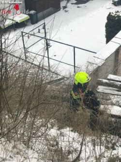 Vor Ort wurde die Einsatzstelle vom Einsatzleiter erkundet, wobei bei einem Wohnhaus ein Aushang für eine vermisste Katze und eine Nachbarin, welche den Notruf gewählt hatte, vorgefunden wurde. Nach Befragung der Anruferin wurde eine Absturzsicherung aufgebaut und ein Feuerwehrmann mittels 5-Punkt Geschirr und Absturzsicherung gesichert auf den steilen Hang hinabgelassen.