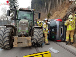 Um den Patienten zu befreien, musste zunächst der Traktor einige Meter nach hinten manövriert werden, ehe mit der eigentlichen Rettung begonnen werden konnte. Zeitgleich landete neben der Unfallstelle der Rettungshubschrauber. Nachdem Platz geschaffen wurde, wurde der Pkw stabilisiert und anschließend das Glasdach mit speziellen Sägen und eine Strebe mit der Bergeschere entfernt, um den Fahrer schonend befreien zu können. Er wurde mit Verletzungen unbestimmten Grades ins Krankenhaus geflogen. Der Lenker des Traktors blieb bei dem Unfall unverletzt.