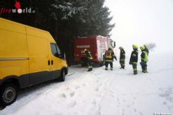 Ein Lieferwagen kam auf der winterlichen Fahrbahn ins Rutschen und blieb in einer angrenzenden Wiese hängen. Nach der Erkundung durch den Einsatzleiter wurde der Kleinbus mithilfe der Seilwinde aus der schneebedeckten Wiese gezogen.