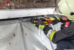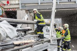 Nachdem die auf der Fahrbahn liegenden Teile vom Einsatzleiter gesichtet wurden, gab er den Auftrag den gesamten Aufbau zu zerlegen und auf den Lkw wieder zu verladen. Mit Hilfe einer Akkusäge wurde die Plane von den Eisenverstrebungen getrennt. Und händisch auf den Lkw verladen.