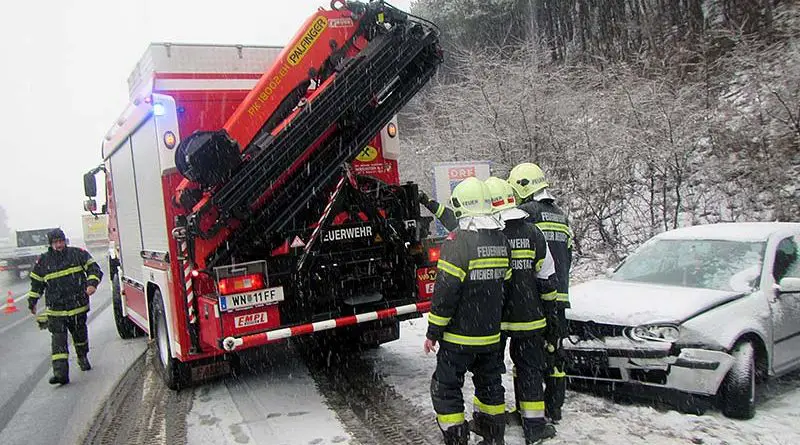 WIENER NEUSTADT (NÖ): Der Schneefall am Dienstagmorgen, den 6. März 2018, sorgte im Frühverkehr für einiges Chaos. Die Feuerwehr Wiener Neustadt wurde auf die Südautobahn gerufen, um einen Pkw aus dem Graben zu ziehen.