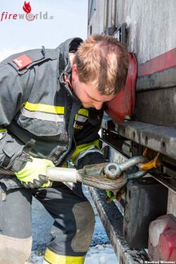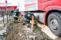 Um die Frontschürze der Zugmaschine nicht zu beschädigen, wurden die abgerutschten Räder mit Holz unterbaut. Schlussendlich konnte der Sattelzug in engem Zusammenspiel der beiden Seilwinden soweit zurückgezogen werden, dass das Tanklöschfahrzeug der FF Dürnstein die Unfallstelle passieren konnte.