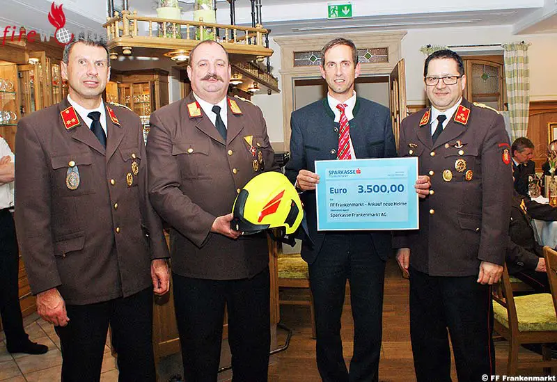 Der Kommandant der FF Frankenmarkt ABI Karl-Heinz Kirtsch konnte im Zuge der Vollversammlung eine großzügige Spende in der Höhe von EUR 3.500,- von Direktor Mag. Alexander Proksch von der Sparkasse Frankenmarkt entgegenehmen. Die Unterstützung dient zum Neuankauf von 65 Einsatzhelmen Marke HEROS-titan der Fa. Rosenbauer. Die Helme mit einem Stückpreis von ca. EUR 260,- sind bereits im Einsatz und werden von der Mannschaft sehr geschätzt. Auf diesem Wege möchten wir uns bei der Sparkasse Frankenmarkt nochmals recht herzlich bedanken!