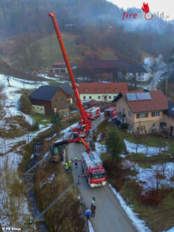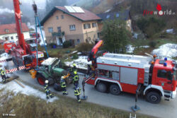 LAUSSA (OÖ): Der technische Zug der Feuerwehr Steyr wurde um 05:22 Uhr des 7. März 2018 zu einer Traktorbergung in die Laussa alarmiert. Kurz darauf rückte der Technische Zug mit Kran Steyr, Rüst 2 (SRF) und Last 3 (Kranbegleitcontainer) zur Einsatzadresse aus.