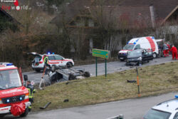 Aus bisher unbekannter Ursache kollidierten Samstagnachmittag auf der Wiener Straße im Bereich der Ortschaft Mösenthal in Vöcklamarkt zwei Fahrzeuge beinahe frontal. Ein Pkw überschlug sich und kam am Dach liegend im Straßengraben zum Stillstand. Drei Personen erlitten leichte und eine Person schwere Verletzungen. Die Verletzten wurden nach der notärztlichen Erstversorgung am Einsatzort ins Krankenhaus eingeliefert. Die Feuerwehr führte die Aufräumarbeiten am Unfallort durch.