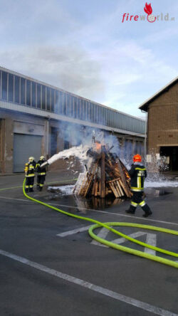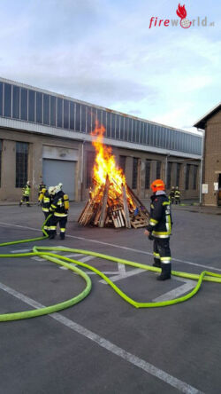 Unter der Leitung von LM d.F. Sprung Stefan war es die Aufgabe, einen Brand von Problemstoffen in einem Container (simuliert durch einen Holzstapelbrand) zu bekämpfen.