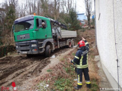 KALTENLEUTGEBEN (NÖ): Nach einer Tierrettung um Mitternacht wurde die Freiwillige Feuerwehr Kaltenleutgeben am späten Vormittag des 14. März 2018 zu einem weiteren Einsatz gerufen. Ein Lkw steckte auf einem Privatgrundstück fest.