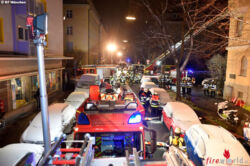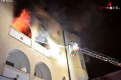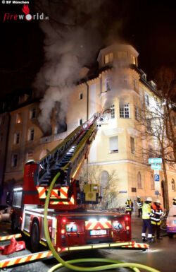 Die Integrierte Leitstelle alarmierte umgehend zwei Löschzüge der Berufsfeuerwehr sowie mehrere Fahrzeuge der Freiwilligen Feuerwehr München. Bei der Ankunft der Rettungskräfte schlugen bereits meterhohe Flammen aus dem gemeldeten Geschoss des fünfstöckigen Gebäudes.