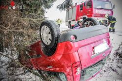 Oö: Pkw kommt von der Fahrbahn ab und bleibt am Dach liegen