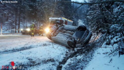 Beim Eintreffen am Einsatzort wurde vom Einsatzleiter folgende Schadenslage festgestellt: Bei winterlichen Verhältnissen kam ein Lenker in einer Kurve von der rutschigen Fahrbahn ab. Das Fahrzeug überschlug sich dabei und blieb im Straßengraben auf der Seite liegen. Der Lenker blieb dabei unverletzt und konnte mit Hilfe von Ersthelfern das Fahrzeug über die Beifahrertür verlassen.