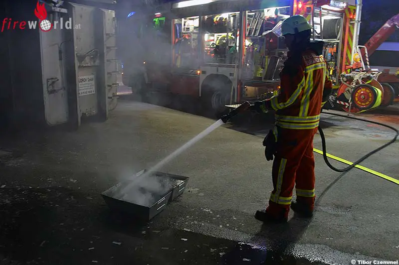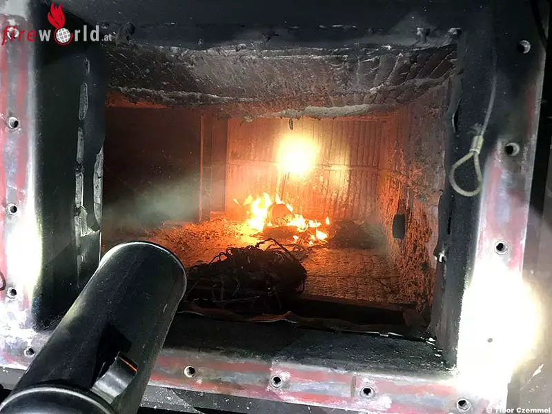 Unter Atemschutz konnte der aktive Brand in der Wärmekammer mit mehreren CO2-Löschern rasch eingedämmt werden. Durch die Hitze in der Kammer flammte das Feuer aber immer wieder auf. Das Brandgut musste vom Atemschutztrupp herausgeschaufelt und von einem weiteren Atemschutztrupp in Schüttwannen ins Freie gebracht werden. Dort wurde das Brandgut ausgiebig gewässert und abgelöscht.