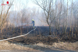 ANSFELDEN (OÖ): Am 25. März 2018 wurde die Feuerwehr Ansfelden um 17:10 Uhr mit den Einsatzstichworten „Brand Baum / Flur / Böschung“ in die Traunauen alarmiert. Die Ersteintreffenden Fahrzeuge Kommando und Tank Ansfelden fanden einen ausgedehnten Flurbrand auf der Fläche von 100 x 30 Meter vor.