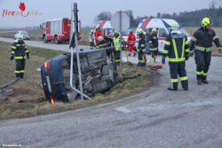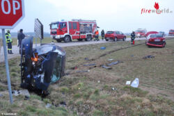 Der Unfall ereignete sich im Kreuzungsbereich der Leombacher Straße mit der Eggendorfer Straße in Sipbachzell (Bezirk Wels-Land). Aus bisher unbekannten Gründen kollidierten zwei Fahrzeuge im Kreuzungsbereich und wurden danach in ein angrenzendes Feld geschleudert. Ein Auto kippte auf die Seite und kam so zum Stillstand. Die Insassen der Unfallfahrzeuge konnten sich bis zum Eintreffen der Einsatzkräfte bereits selbst aus den Fahrzeugen befreien. Insgesamt wurden bei dem Unfall drei Personen verletzt und nach der Erstversorgung durch den Rettungsdienst ins Klinikum Wels eingeliefert. Die Feuerwehren sicherte die Unfallstelle ab und führte erste Aufräumarbeiten durch. Ausgelaufene Betriebsmittel wurden gebunden, Fahrzeugteile aus dem Kreuzungsbereich entfernt. Für die Bergung der Fahrzeuge wurde ein Abschleppdienst angefordert.