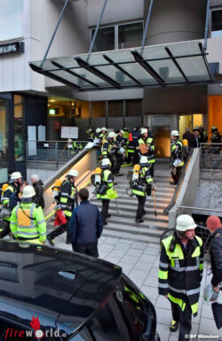 Der Hausmeister empfing die Einsatzkräfte und teilte ihnen mit, dass es im Untergeschoss im Bereich der Müllpresse brennen würde. Sofort wurden mehrere Atemschutztrupps in das Gebäude geschickt. Aufgrund der Größe des Komplexes wurden umgehend auch weitere Einsatzkräfte nachalarmiert.