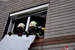 Nachdem die Meldung „Brand aus“ durch den Trupp gekommen war, wurde umgehend der Lüfter in Stellung gebracht um den verrauchten Bereich dementsprechend zu entrauchen.