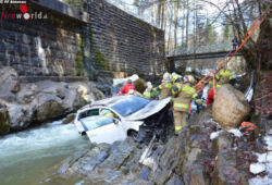 Die Erstkräfte der Feuerwehr eilten mit Sicherungsmaterial über einen Steg, der in der Nähe der Unfallstelle über den Bach führte, und bauten am Gegenhang mehrere Sicherungsleinen auf, um einen sicheren Abstieg der Einsatzkräfte zu gewährleiten. Danach wurde der Pkw, der mit dem Heck im reißenden Bach stand, mit Zurrgurte gegen ein Abrutschen in das Bachbett gesichert. Bei der Ankunft der Feuerwehr befanden sich drei der vier Insassen noch im Fahrzeug.