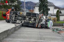 Der Lenker des Schwerfahrzeuges hat ersten Informationen zufolge Donnerstagfrüh offenbar bei einem Umkehrmanöver eine Mauerkante eines Parkplatzes übersehen und dachte es gehe eben weiter. Der Lkw kippte über die Kante und stürzte daraufhin um. Der Lenker blieb bei dem Unfall unverletzt.