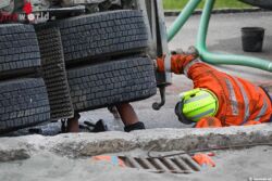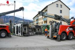 Der Inhalt wurde abgesaugt und ein Spezialbergeunternehmen zur Lkw-Bergung angefordert. Mit Hilfe von zwei Bergefahrzeugen gelang es schließlich das Fahrzeug wieder auf die Räder zu stellen. Die Feuerwehr stand bei den Aufräumarbeiten ebenfalls im Einsatz, da Betriebsmittel in einen Sickerschacht gelangt waren. Bindemittel musste zusätzlich aufgetragen werden. Ein Hydrologe wurde angefordert.