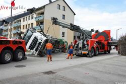 KIRCHDORF AN DER KREMS (OÖ): Schwierig gestaltete sich am Donnerstag, den 5. April 2018, die Bergung eines umgestürzten Kanalreinigungsfahrzeuges in einem Siedlungsgebiet in Kirchdorf an der Krems.