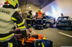 Parallel dazu ereignete sich am anderen Ende des Tunnels im Rückstau ein schwerer Auffahrunfall mit drei verletzten Personen, wodurch der Anfahrtsweg der anrückenden Feuerwehren Kalwang und Mautern blockiert wurde. In Zusammenarbeit mit dem Roten Kreuz mussten die verletzten Personen versorgt und die Menschenrettung aus den Unfallfahrzeugen durchgeführt werden.