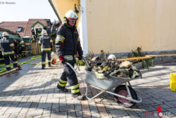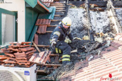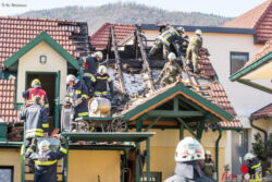 Parallel zu den Löscharbeiten begaben sich Feuerwehrkräfte in das Gebäude um mit Wassersaugern das Löschwasser im Gebäude aufzufangen um einen größeren Wasserschaden zu vermeiden. Händisch wurde der Dachbereich abgeräumt, auf Glutnester untersucht und gezielt abgelöscht. Teilweise musste der Dachbereich mit Kettensägen geöffnet und glosendes Dämmmaterial entfernt werden. Durch den raschen Einsatz der Feuerwehr konnte der Brand auf die Ausbruchstelle beschränkt und ein weiterer, noch größerer Schaden erfolgreich verhindert werden.