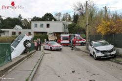 Sofort wurde durch die anwesende Mannschaft ein Brandschutz aufgebaut und begonnen, den absturzgefährdeten Pkw mittel zwei Kränen zuerst zu sichern, im Anschluss gleich zu bergen und gesichert abzustellen. Der zweite Pkw wurde händisch ebenfalls gesichert am Straßenrand abgestellt.